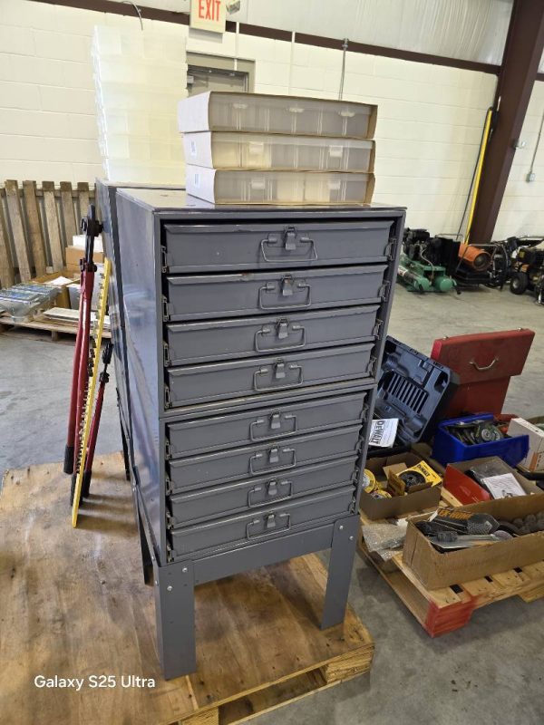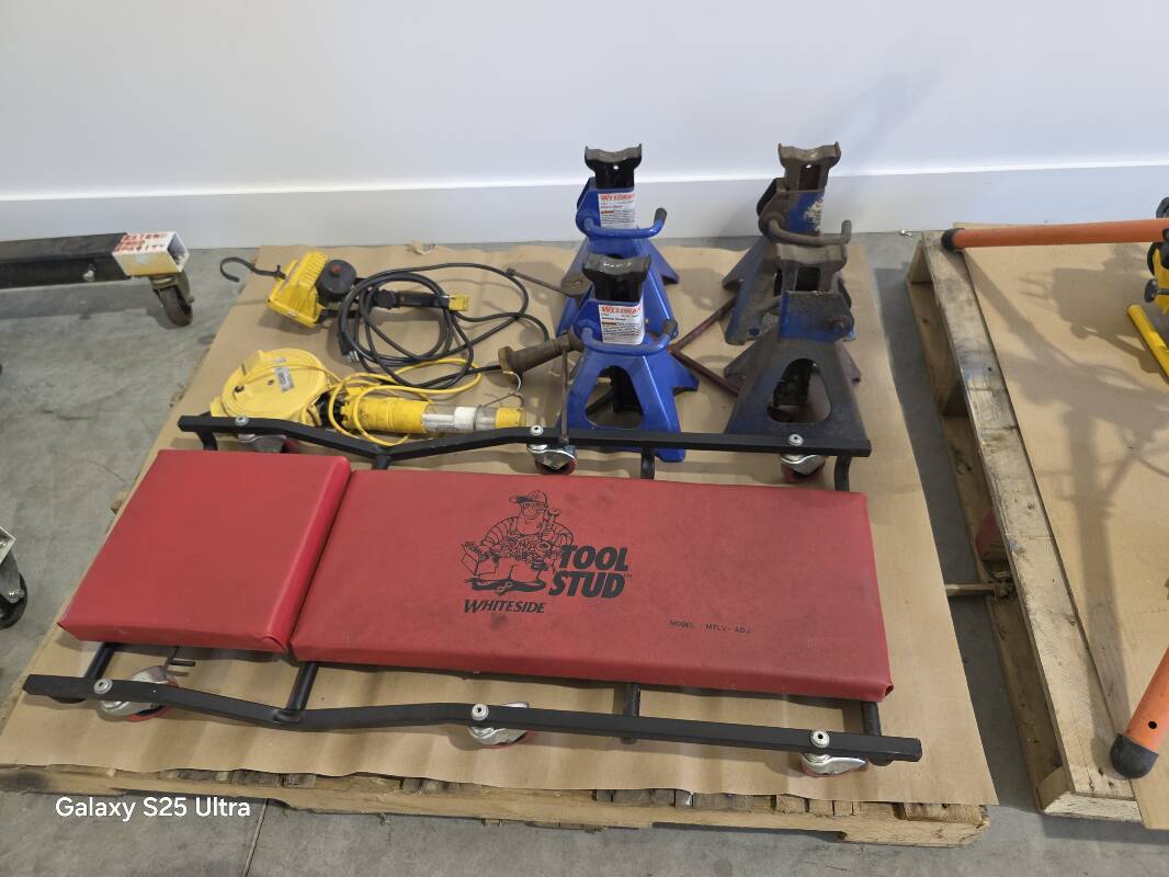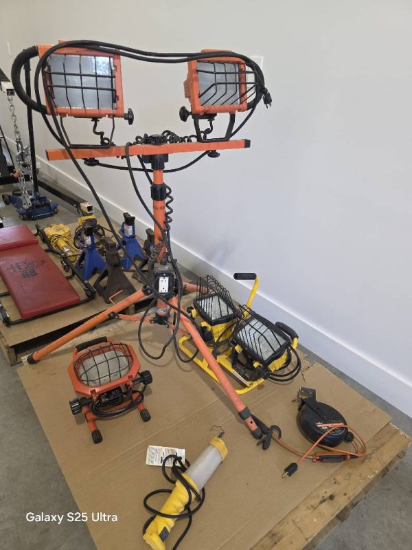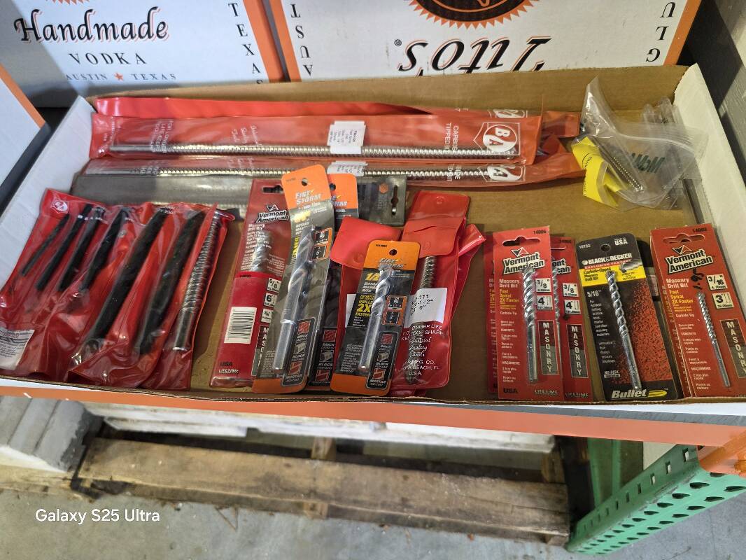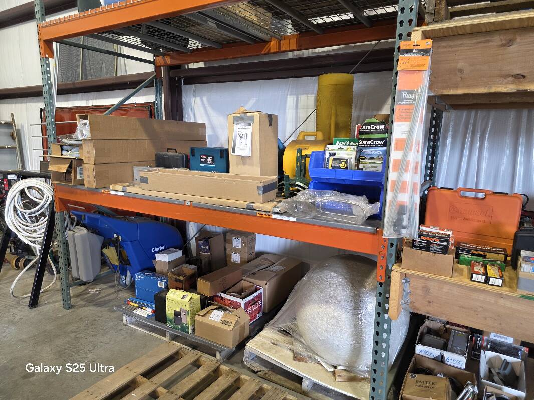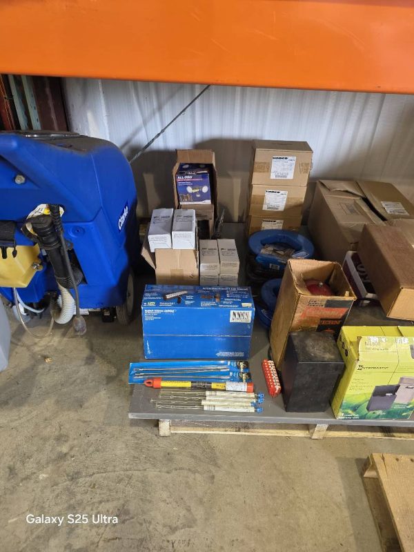 Compartmented Plastic Cases with Latches and Hinged Lid, PVC and Steel Conduit Clamps, Aluminum and Steel Rivet Assortment, Varies Size Lag Bolts, Rivet Gun, Riviter Kit, Plastic Case, Assorted Rivets, Soldering Gun Kit, Electronic Heat Gun. Concentrator/Diffuser, Heat Shrink Butt Connectors, Clamps, Concrete mixer, Outlets, Receptacles, Antennas, Dimmers, Wiring, Plugs, Wall Plates, Switches, Organizers, Wall/Bench Cabinet, Impact Wrenches, Hammers, Connectors, Tile Saw and Blades, Drills, Demo Hammers, Fasteners, Cord Caddy, Paper Cutters, Nail Guns, Staple Guns, Flood Lights, Halogen Lamps, Landscape Lighting Cords, Trash Cans, Carpet Extractors, Fish Tape, Locking Boring Kit, Battery Chargers, Bits, Pliers, Dowel Rods, Ventilator, Sprayer, Air Mover, Sprinklers, Framing Nailer, Shank Nails, Trash Cans, 52 qt Cooler, 100 qt Ice Chest, Sockets, 2-Shelved Sliding Door Cabinet, Video Cables, Coax, Sand Discs, Orbital Sanders, Die Grinder, Coveralls, Battery Chargers, Torque Wrenches, Tool Boxes, Bolt Cutters, Mig Welder, Welding Helmets, 2 Ton Hydraulic Engine Crane, 4 Ton and 2.5 Ton Hydraulic Jacks, 4 Ton Vehicle Stands, Work Lights, Screw Jacks, Grinding Cones and Discs, Vacuums, Pumps, Drums, Rope, Tarps, Moving Boxes, Hoses, Carts, Bicycles, Scaffold, 5-Drawer Lateral Files, Brake Shoes, Wheel Bearings, Sterring Box, Coil Springs, Suspension Parks, Radiator, Gas Tank, Soldering items, Car Vents ,Steel Bins, Fender Supports, Gym Weight Lifting Machine, Aluminum Ladders, Auto Twirler, Hole Saws, Arbors, Cutters and Much, Much More.